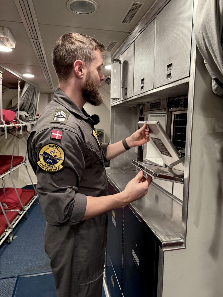 Simon viser rundt i et AWACS-fly - her er han i flyets bagerste del i køkkenet.