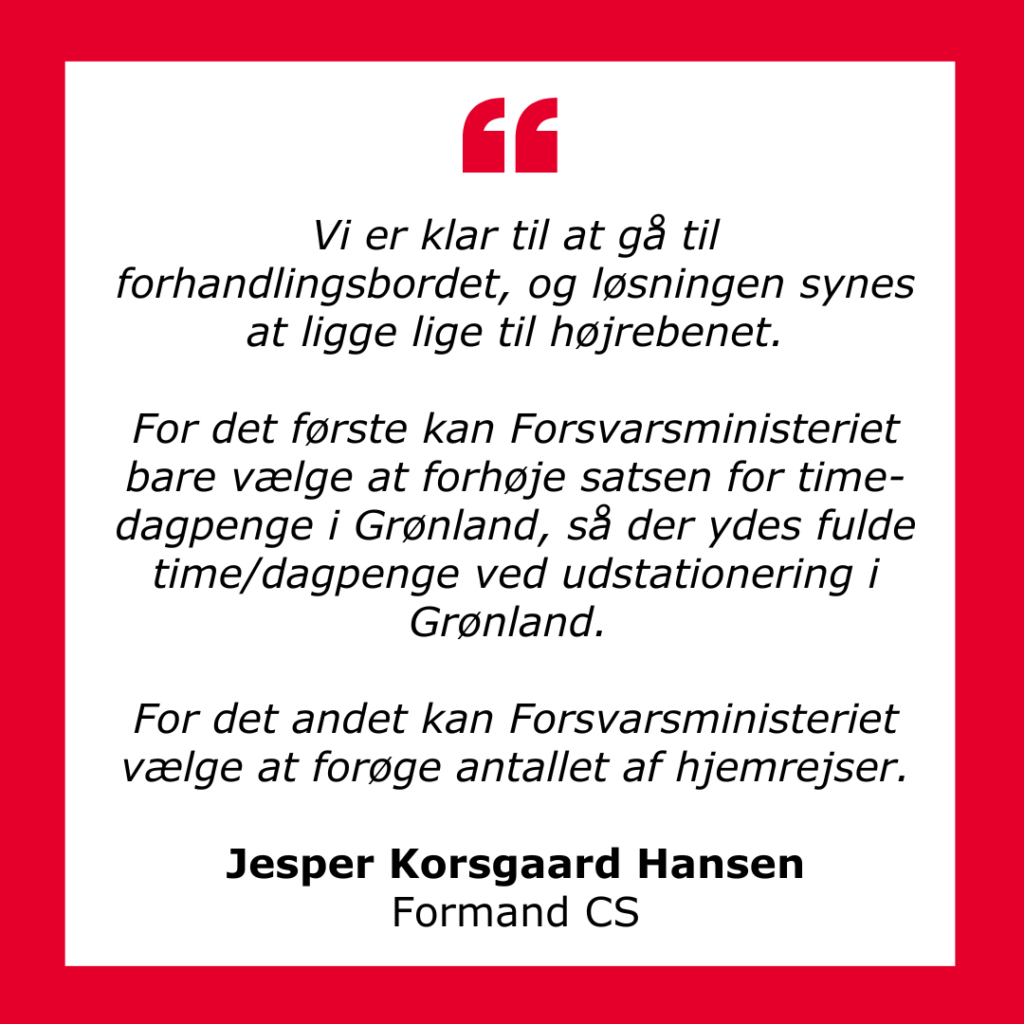 Det kan dreje sig om grønlandsk skattelovgivning, pasningsgaranti, det grønlandske skole- og sundhedssystem. Det er alle områder, der falder udenfor Grønlandsaftalens dækningsområde, og som CS ikke har nogen direkte indflydelse på. Det betyder imidlertid ikke, at vi ikke har en mening om tingene. Men vi kan alene påvirke disse problemstillinger politisk, hvilket formanden også gør i alle de sammenhænge i Forsvaret og med folketingspolitikere, hvor han har mulighed for det.