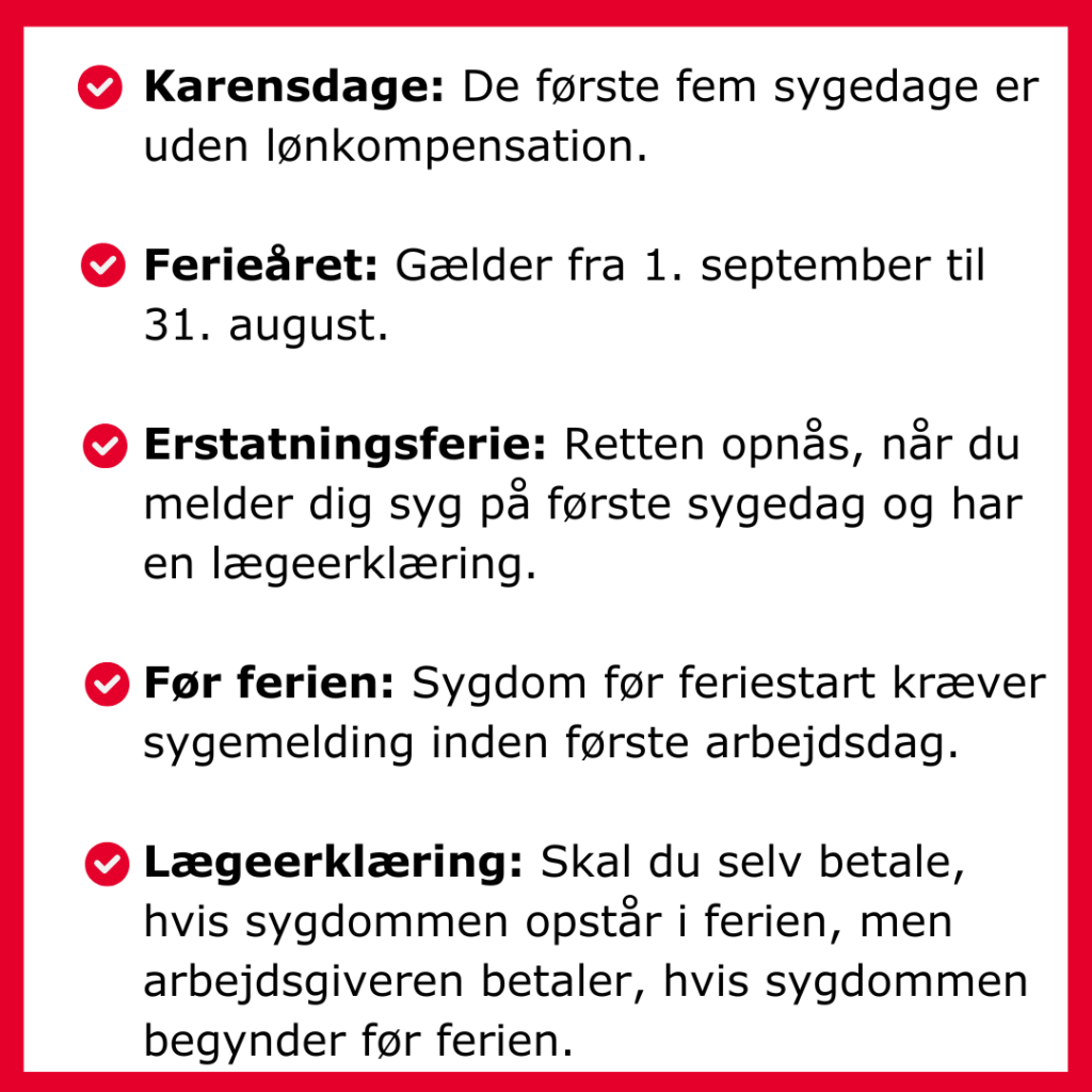 Hvis du bliver syg, inden din ferie går i gang, gælder der andre regler. Her skal du melde dig syg til din arbejdsgiver, inden din ferie begynder og oplyse, at du ikke ønsker at holde ferie.